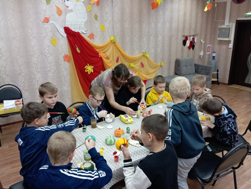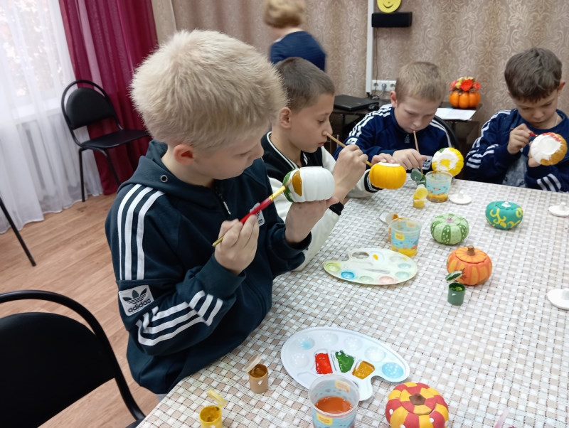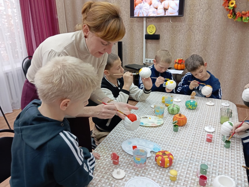 В интеграционной мастерской "Познавайка" дети занимались росписью гипсовых шкатулок в форме тыквы